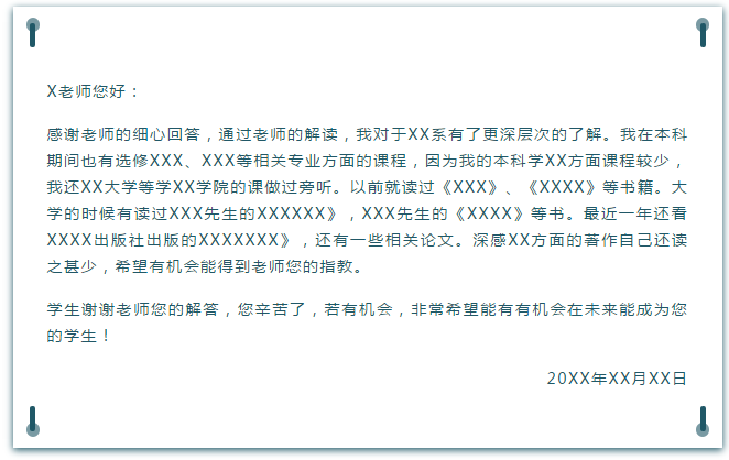 也可以繼續寫,或者等老師回信后,介紹下自己本科時學習過的和專業相關的課程,以及對專業學習做過哪些準備,自己看過哪些關于報考專業方面的書和專著,同時表示自己這方面書看的太少,有待提高,同時對老師的回復表示感謝。