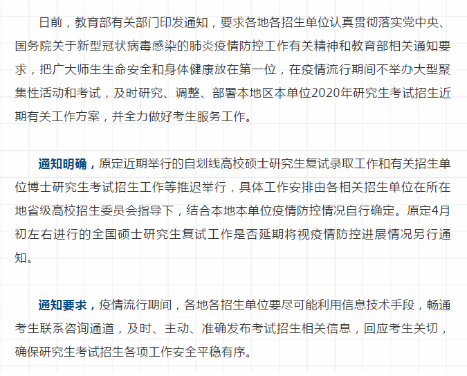 也就是說:原定4月初左右進(jìn)行的全國(guó)碩士研究生復(fù)試工作是否延期將視疫情防控進(jìn)展情況另行通知。