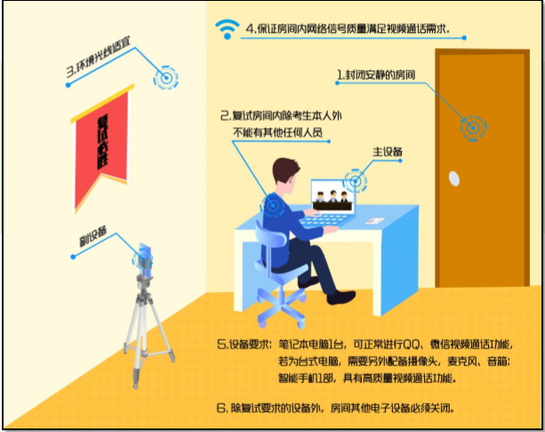 與家人溝通好,保證復(fù)試時無人打擾,周圍環(huán)境安靜無異響。條件不能保證的可以提前選擇去網(wǎng)絡(luò)好的酒店。