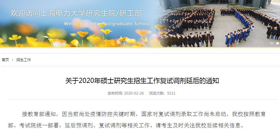 在上海電力大學(xué)官網(wǎng)上發(fā)現(xiàn)了復(fù)試調(diào)劑延后的通知:接教育部通知,因當(dāng)前尚處疫情防控關(guān)鍵時(shí)期,國(guó)家對(duì)復(fù)試調(diào)劑錄取工作尚未啟動(dòng),我校按照教育部、考試院統(tǒng)一部署,延后預(yù)調(diào)劑、復(fù)試調(diào)劑等相關(guān)工作。請(qǐng)考生及時(shí)關(guān)注我校后續(xù)相關(guān)信息。