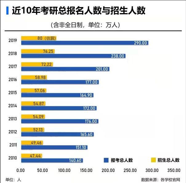 2019年,我國(guó)碩士研究生報(bào)名人數(shù)290萬(wàn),統(tǒng)計(jì)局公布的全年研究生招生是91.7萬(wàn)人。根據(jù)第三方的不完全統(tǒng)計(jì),2019年全國(guó)各大院校博士招生人數(shù)大約在7.5人至8萬(wàn)人左右,那么,2019年碩士研究生的最終招生在83萬(wàn)左右,碩士研究生錄取率約為2.86:1。這個(gè)數(shù)據(jù)與近年來(lái)的研究生錄取率基本一致,都是在3:1左右徘徊。