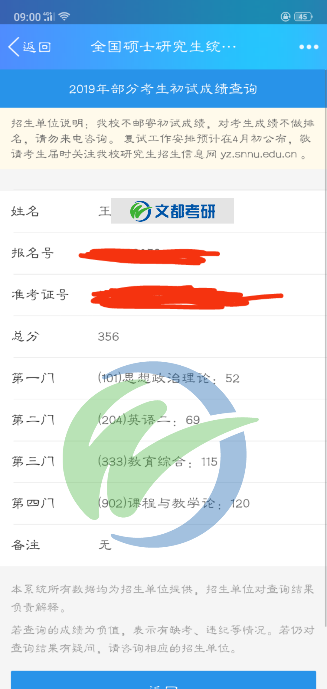 2019全國研究生招生考試初試成績已于本月15日起陸續(xù)公布,西北文都考研2019屆考研學(xué)子用成績證明自己過去日以繼日的付出并沒有白費。近日,西北地區(qū)各省市高分學(xué)員紛紛發(fā)來自己的研究生初試成績,那一張張興奮的臉龐洋溢的喜悅,也感染著文都考研的全體老師,文都老師紛紛賀電并表示:只要文都學(xué)子如愿進入自己理想的院校,就是對自己最好的回報。接下來,就跟著西北文都考研小編一起看看我們文都考研優(yōu)秀的學(xué)子發(fā)來的喜報吧。