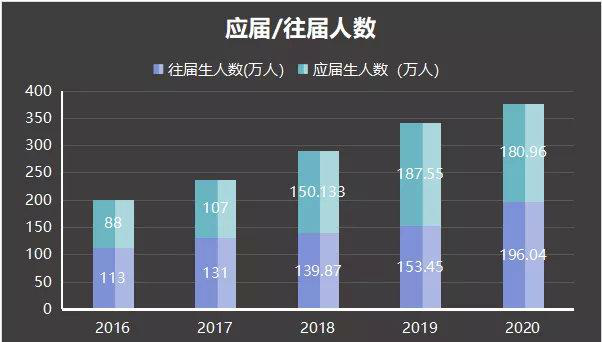 考研,始終是千軍萬(wàn)馬過獨(dú)木橋!二戰(zhàn)人數(shù)有多少?2016~2020年報(bào)名的應(yīng)屆生和往屆生人數(shù)如下。