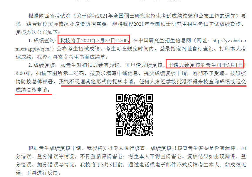 2. 成績(jī)復(fù)核:如考生對(duì)初試成績(jī)有異議,可申請(qǐng)成績(jī)復(fù)核。申請(qǐng)成績(jī)復(fù)核的考生可于3月1日18:00前,掃描下圖所示二維碼,按要求填寫(xiě)申請(qǐng)信息,提交成績(jī)復(fù)核申請(qǐng),逾期不予受理。按照疫情防控總體部署,我校不受理其他形式的復(fù)核申請(qǐng),任何人未經(jīng)學(xué)校批準(zhǔn)不得來(lái)校查詢(xún)成績(jī)或遞交成績(jī)復(fù)核申請(qǐng)。