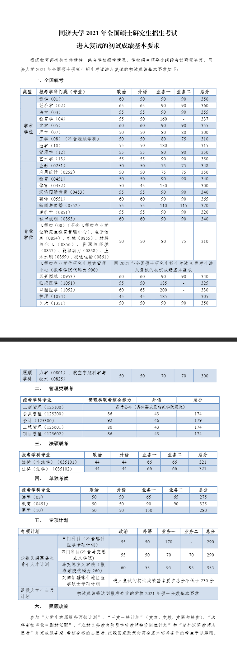 同濟大學2021年碩士研究生入學考試復試基本分數線