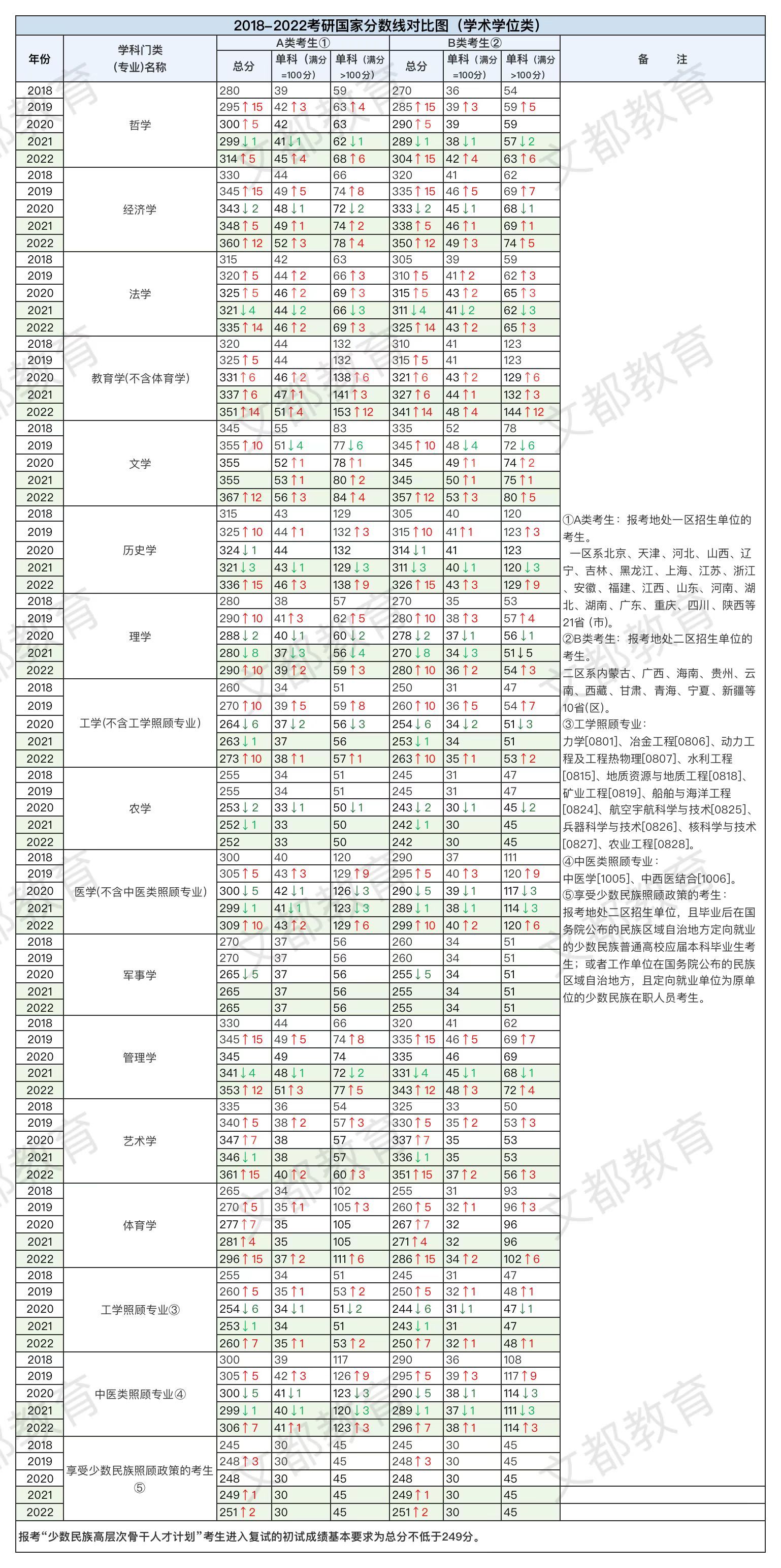 2018-2022考研國家分數(shù)線對比圖(學術學位類)
