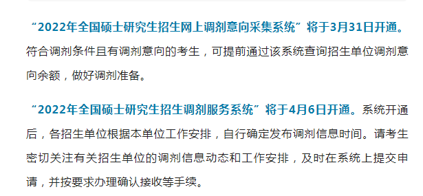 “2022年全國(guó)碩士研究生招生調(diào)劑服務(wù)系統(tǒng)”將于4月6日開(kāi)通。系統(tǒng)開(kāi)通后,各招生單位根據(jù)本單位工作安排,自行確定發(fā)布調(diào)劑信息時(shí)間。請(qǐng)考生密切關(guān)注有關(guān)招生單位的調(diào)劑信息動(dòng)態(tài)和工作安排,及時(shí)在系統(tǒng)上提交申請(qǐng),并按要求辦理確認(rèn)接收等手續(xù)。
