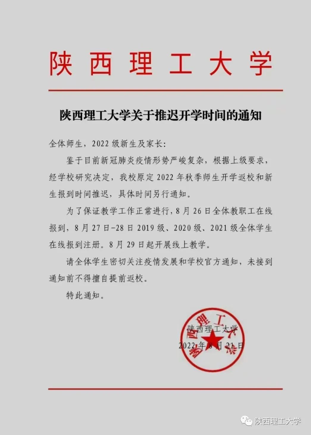 陜西理工大學(xué)關(guān)于推遲開學(xué)時(shí)間的通知