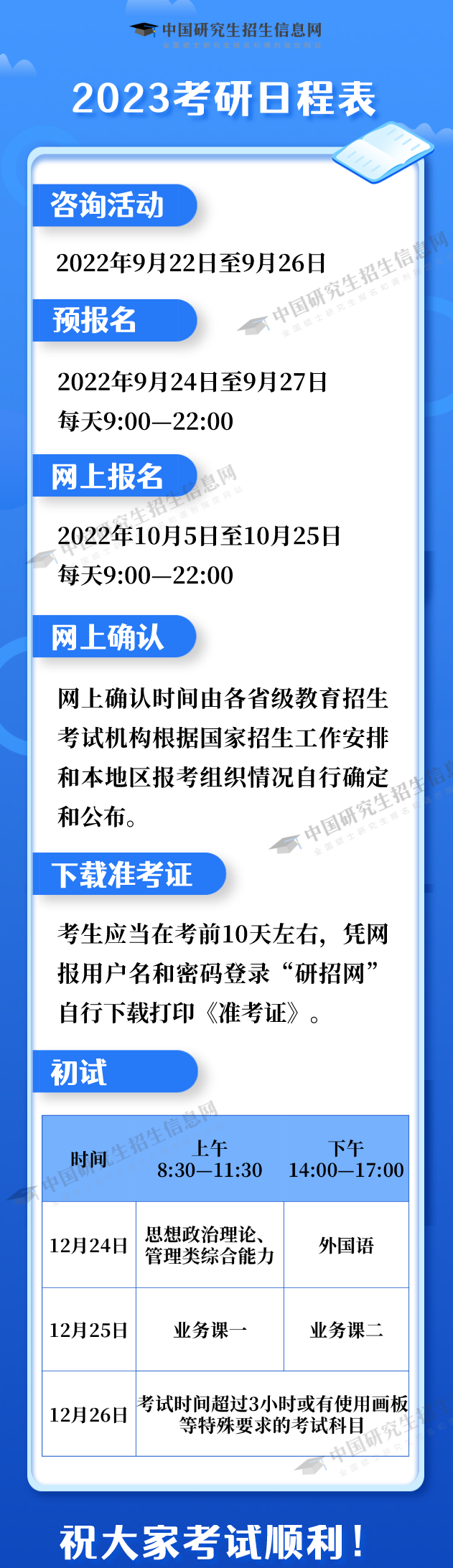 2023年全國(guó)碩士研究生招生考試初試定于2022年12月24日至25日,考試時(shí)間超過3小時(shí)或有使用畫板等特殊要求的少數(shù)考試科目安排在12月26日。網(wǎng)上報(bào)名工作安排在10月5日至10月25日(每天9:00—22:00),預(yù)報(bào)名工作安排在9月24日至9月27日(每天9:00—22:00)。屆時(shí)考生可登錄“中國(guó)研究生招生信息網(wǎng)”(網(wǎng)址:https://yz.ch咨詢活動(dòng):9月22日至26日新