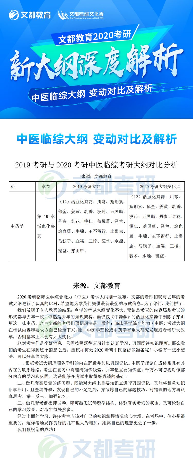 2020年全國碩士研究生招生考試各科目考研大綱已于7月8日發布,對于考生來說這是非常好的消息,有充足的時間根據新的大綱知識點進行專業課復習,考研中醫臨綜大綱對參加研究生考試的考生考研中醫臨綜復習具有指導意義,它可以有效矯正考生復習方向偏差的問題,讓復習方向化零為整,提高效率。如果你還不清楚,不妨看看2019考研與2020考研中醫臨綜大綱變動對比分析的文章,如有需要及時加入陜西文都20考研交流群, 陜西文都考研網持續為您提供考研所需的相關指導信息。20考研資料共享:【互動可加群】丨官方網站【@陜西文都考研】