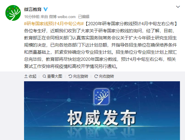 以上是小編為大家整理的“考研國家線什么時候公布?教育部:預計4月中旬公布”的相關內容,希望對大家考研有所幫助!