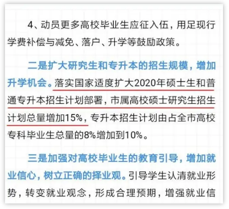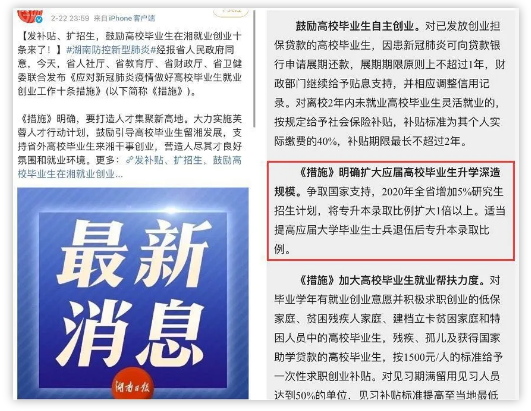 2月22日,湖南省人社廳、省教育廳、省財(cái)政廳、省衛(wèi)健委聯(lián)合發(fā)布《應(yīng)對(duì)新冠肺炎疫情做好高校畢業(yè)生就業(yè)創(chuàng)業(yè)工作十條措施》,其中一條為,明確擴(kuò)大高校畢業(yè)生升學(xué)深造規(guī)模,2020年全省增加5%研究生招生計(jì)劃。