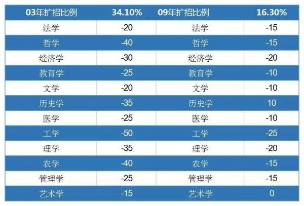 從2003年的擴招可以看出,不同學科之間在面對整體上的擴招之后,國家線的下降幅度是不同的,而且相差巨大,我們從前文中可以看出,是在15-50分之間,分數(shù)下降的最多的是工學,下滑分別達到了50分和25分,而國家線下降幅度最小的則是藝術(shù)學,僅僅為15%。那么我們對照這一下降來看的話,今年擴招,是不是也是這樣的一個變化呢?