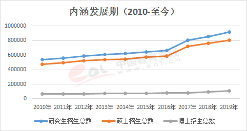 (2010年至今,研究生招生規(guī)模增長速度整體有所放緩,研究生教育由外延式擴張階段逐步向內(nèi)涵式發(fā)展階段轉(zhuǎn)變。1978年到2019年的四十一年間,研究生教育快速發(fā)展,招生人數(shù)累計達到1084萬人,其中碩士研究生約943萬人。)