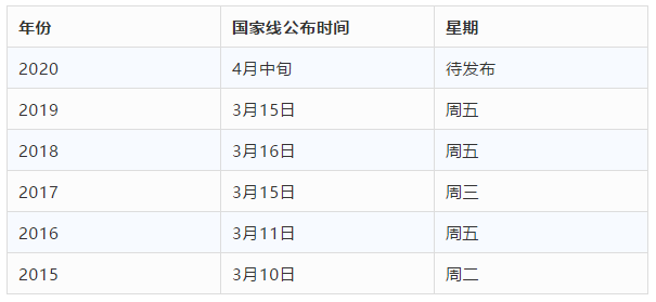 根據(jù)近五年國家線公布時間的規(guī)律,國家線一般在周二、周三、周五發(fā)布。近五年考研國家線的公布時間如下: