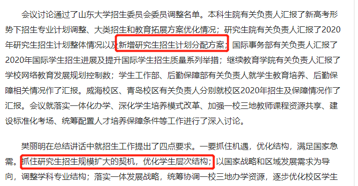 此外山東大學也在《招生委員會2020年度第一次會議》表示擴招,但還沒有公布具體的擴招計劃。