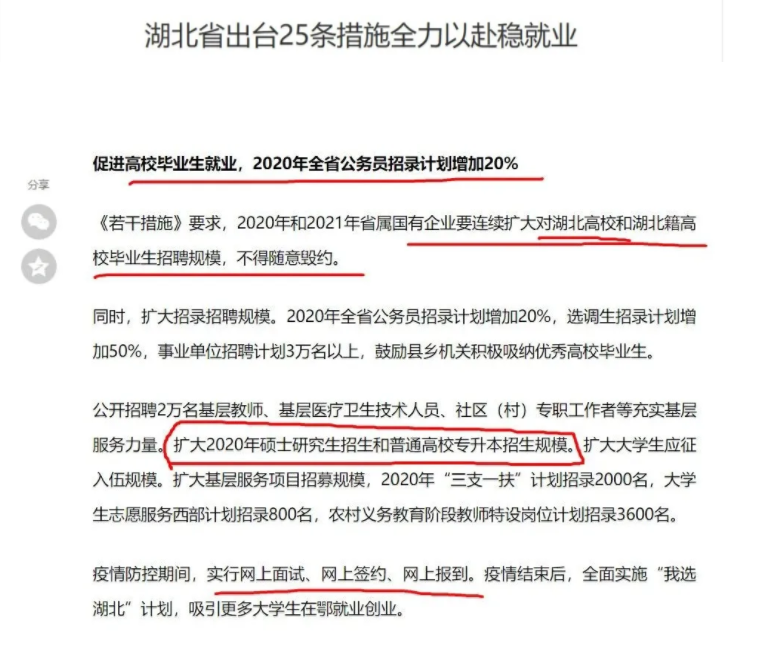 雖然沒有提到具體的碩士擴招數據,但是從公務員的招錄計劃增量、選調生的招錄計劃增量、事業單位招聘計劃增量來看,今年湖北地區高校碩士招生也會有較大規模的擴招。