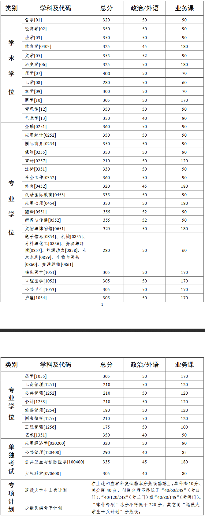 1. 以上為我校復試基本分數線。各招生單位在學校復試基本分數線之上,可結合生源和招生計劃等情況,自主確定本單位考生進入復試的初試成績要求及其他學術要求。相關復試工作安排另行通知。