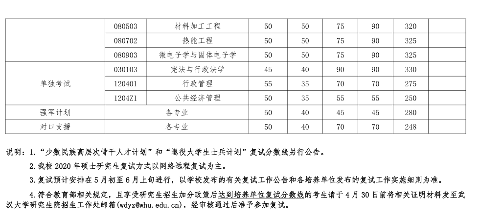 4.符合教育部相關規定,且享受研究生招生加分政策后達到培養單位復試分數線的考生請于4月30日前將相關證明材料發至武漢大學研究生院招生工作處郵箱(wdyz@whu.edu.cn),經審核通過后準予參加復試。