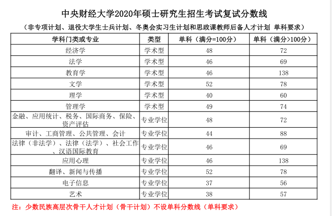 2.中央財經(jīng)大學2020年碩士研究生招生考試復試單科分數(shù)線
