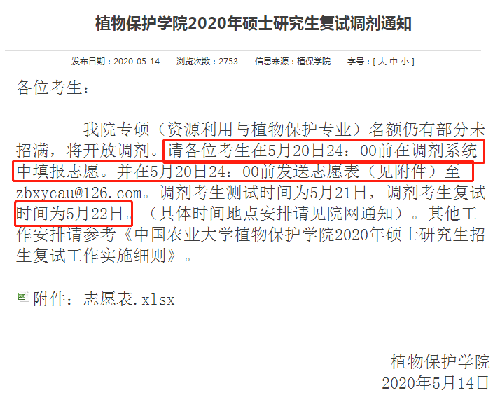 考生回復確認后,方可進行復試。復試方式為遠程網絡復試,請提前準備好相關設備、場地等。植物保護學院請各位考生在5月20日24:00前在調劑系統中填報志愿。并在5月20日24:00前發送志愿表(見附件)至規定郵箱。調劑考生測試時間為5月21日,調劑考生復試時間為5月22日。