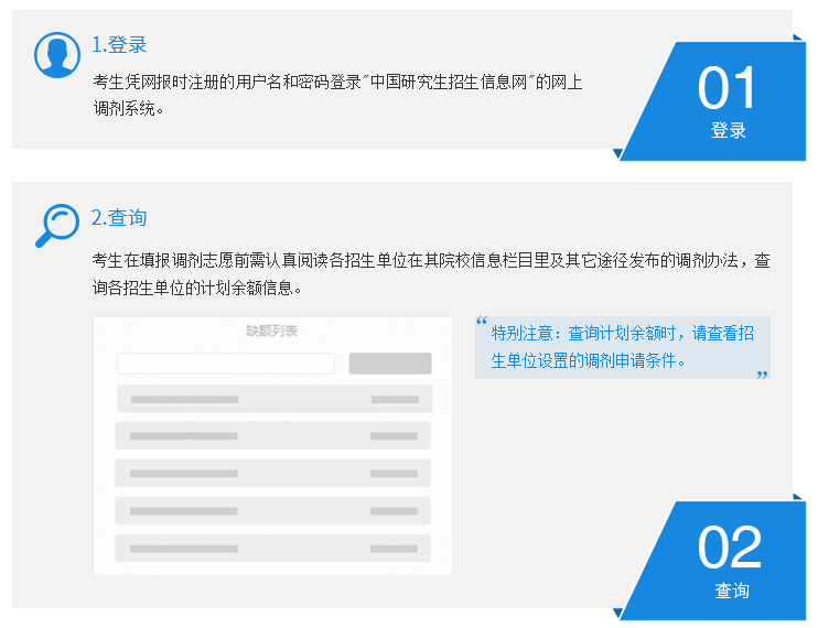 考生需認真閱讀各招生單位在其院校信息欄目里及其他途徑公布的調劑辦法,打開研招網首頁后,用學信網賬號登錄調劑系統后,查詢各招生單位的專業計劃余額信息,特別要留意招生單位的調劑申請條件。