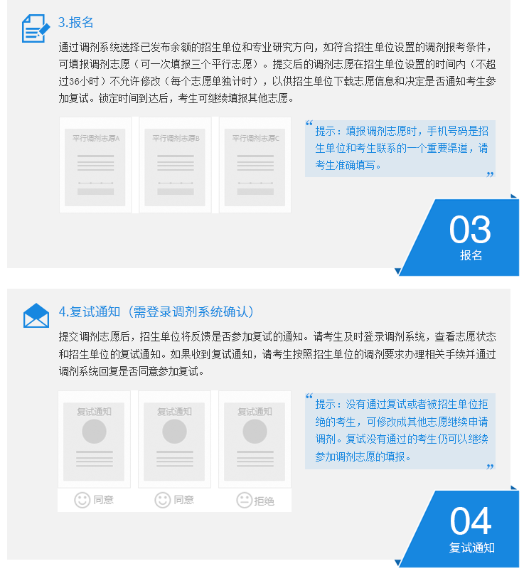 考生如果收到招生單位發送的復試通知,須在招生單位規定的時間內回復是否同意參加復試。復試沒有通過的考生仍可繼續填報其他調劑志愿。