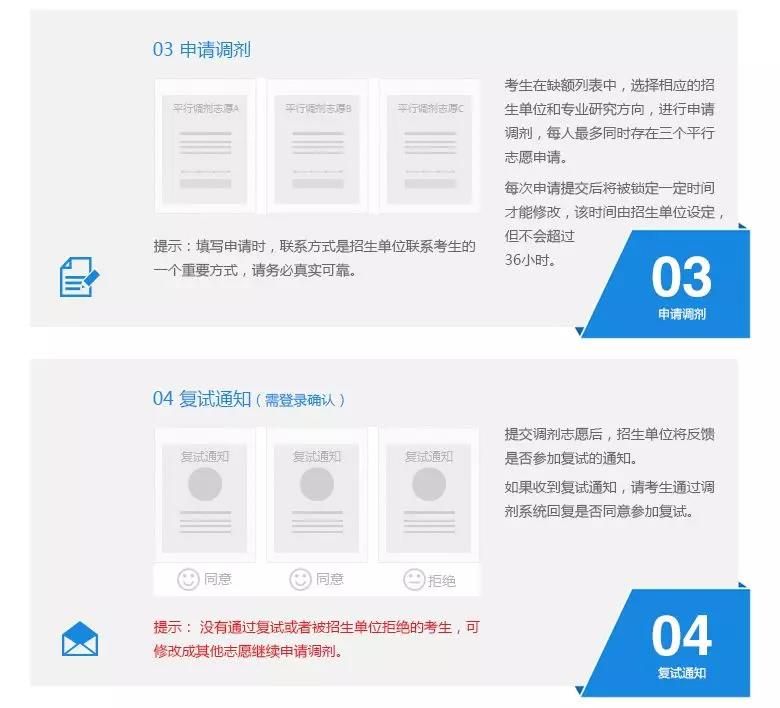 考生如果收到招生單位發(fā)送的復(fù)試通知,須在招生單位規(guī)定的時(shí)間內(nèi)回復(fù)是否同意參加復(fù)試。復(fù)試沒(méi)有通過(guò)的考生仍可繼續(xù)填報(bào)其他調(diào)劑志愿。