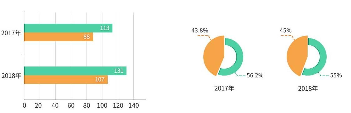 雖然應(yīng)屆生仍然是考研的主力軍,但是隨著在職研究生納入統(tǒng)考后,以及往屆生對于提高自身就業(yè)競爭力的需求增加。據(jù)教育部統(tǒng)計,2017年共201萬人報考,其中,應(yīng)屆考生113萬人,往屆考生88萬人;2018年共238萬人報考,其中,應(yīng)屆考生131萬人,往屆考生107萬人。從數(shù)據(jù)可知,2017年,往屆生考研人數(shù)占全國報考人數(shù)的43.8%,2018年,往屆生考研人數(shù)占全國報考人數(shù)的45%,同比上升了1.2%。