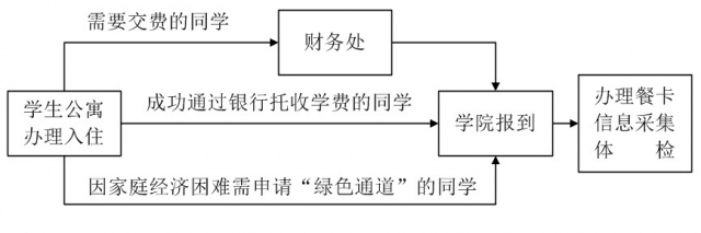 各位同學根據各自的情況,按照下圖所示到財務處、學院報到地點等處辦理入學事宜,入學時間安排詳見附件一。