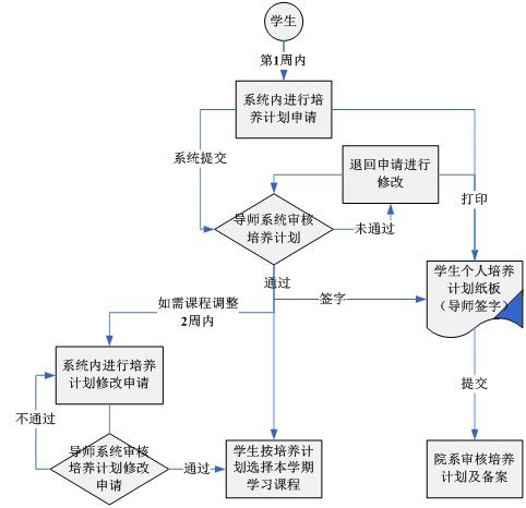 5、學生須于開學報到時與導師共同商定個人培養計劃,個人培養計劃包含學生攻讀學位所必須完成的課程及必修環節,學生應在導師的指導下,根據個人發展需要在滿足學科培養方案要求的前提下制定個人培養計劃,并在系統中進行培養計劃申請,打印培養計劃表,提交導師審核并簽字,導師須在系統審核通過后方能進行選課,提交導師簽字確認的個人培養計劃(紙板)給院系審核并備案。原則上個人培養計劃一經制定不再修改,特殊情況下,學生可在允許的時間范圍內(通常是每學期開學前2周)在系統中提交培養計劃修改申請,導師審核通過后,須提交更新后的個人培養計劃給院系審核備案。