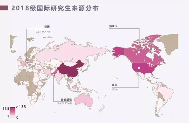 2018年共錄取來自98個(gè)國(guó)家的國(guó)際研究生999人,其中來自美國(guó)、加拿大、巴基斯坦、德國(guó)、韓國(guó)的人數(shù)最多。錄取的國(guó)際研究生中,來自一帶一路沿線國(guó)家的學(xué)生共379人,占國(guó)際研究生錄取總數(shù)的38%。