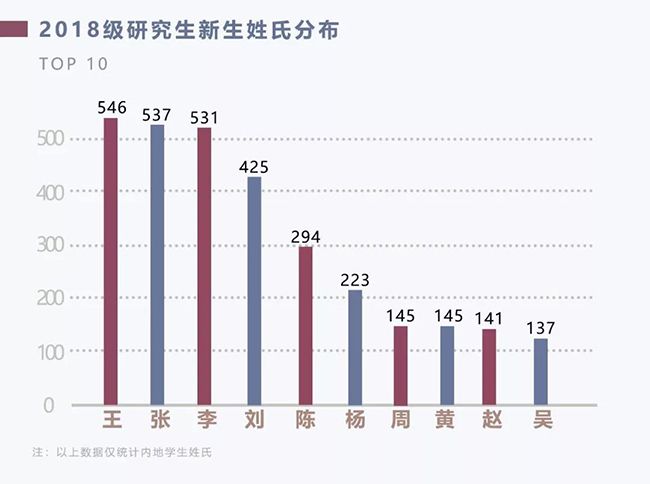 在新生同學(xué)中,我們見到“王同學(xué)”、“張同學(xué)”和“李同學(xué)”的概率最大。碩士生中“張同學(xué)”最多,為350人;博士生中“李同學(xué)”最多,為217人。