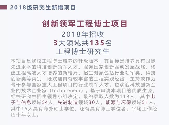 2018級(jí)研究生新增創(chuàng)新領(lǐng)軍工程博士項(xiàng)目,面向行業(yè)領(lǐng)軍類、科技創(chuàng)新類等類別人才進(jìn)行招生,最終錄取來自電子與信息、先進(jìn)制造和能源環(huán)保三大領(lǐng)域的工程博士研究生共135人。