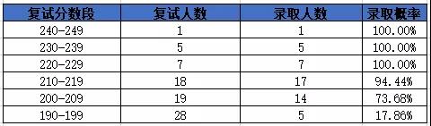全日制一志愿參加復試78人,錄取49人,復錄比1.59;復試最高分242,最低分190分。
