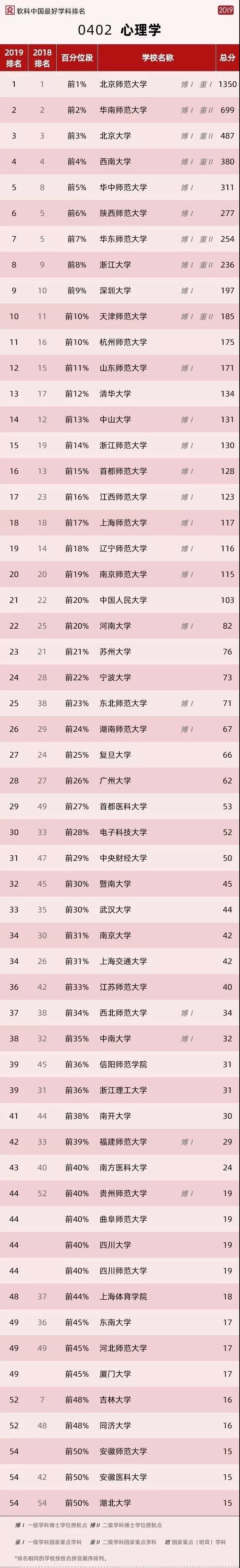 軟科中國今年發布了2019中國學科院校排名,心理學的排名情況如下: