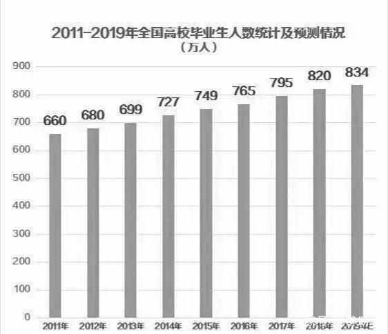 首先,畢業(yè)生人數(shù)的增多。從2011年到2019年,我國高校畢業(yè)生人數(shù)由660萬人增加到834萬人,增加了166萬。2018年大學(xué)應(yīng)屆畢業(yè)生人數(shù)820萬,預(yù)估2019年大學(xué)生畢業(yè)人數(shù)在834萬,比2018年增長了14萬。就業(yè)人數(shù)的增加,與就業(yè)崗位需求量之間的矛盾,會(huì)導(dǎo)致就業(yè)越來越難。2019年285萬考生選擇考研,就從一個(gè)側(cè)面反應(yīng)了就業(yè)難度之大,就業(yè)競爭激烈程度之高。