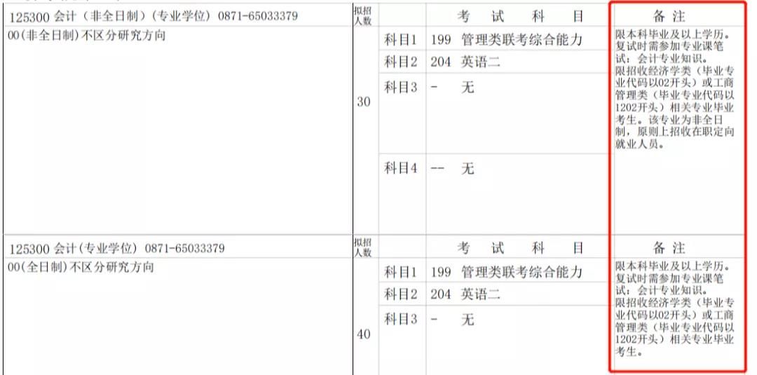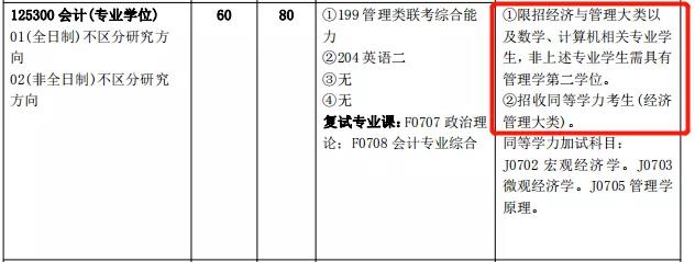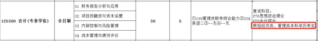 跨考限制:限本科畢業(yè)及以上學(xué)歷。復(fù)試時需參加專業(yè)課筆試:會計專業(yè)知識。限招收經(jīng)濟學(xué)類(畢業(yè)專業(yè)代碼以02開頭)或工商管理類(畢業(yè)專業(yè)代碼以1202開頭)相關(guān)專業(yè)畢業(yè)考生。非全日制的,原則上招收在職定向就業(yè)人員。