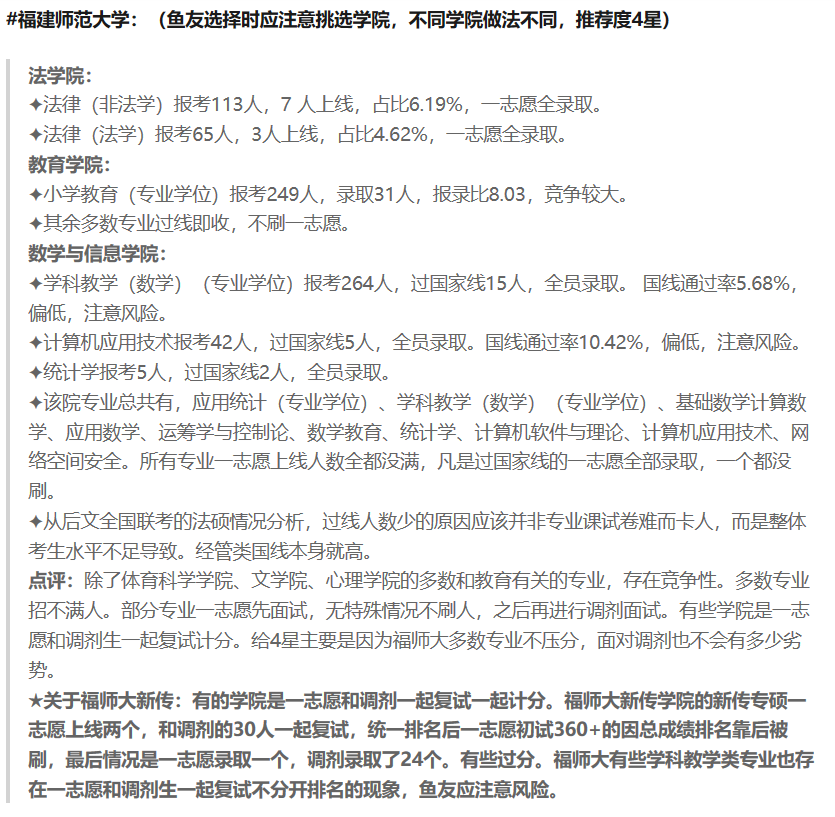 tips:比處,我們不分析專(zhuān)業(yè)課難度。因?yàn)閷?zhuān)業(yè)課難度需要通過(guò)生源比對(duì)+專(zhuān)業(yè)課具體狀況等因素才能定檔。意思就是如果有人和你說(shuō)專(zhuān)業(yè)課很難,這未必準(zhǔn)確。我還要演過(guò)對(duì)比其他公共課的情況才能進(jìn)行一定程度的比較。比如福師大,其法律碩士(非法學(xué))過(guò)線的比例非常低,不知道的人還以為他們專(zhuān)業(yè)課很難。實(shí)則是考生整體水平一般導(dǎo)致的。當(dāng)然,法律碩士整體來(lái)說(shuō)的過(guò)線的比例就是比較低的。