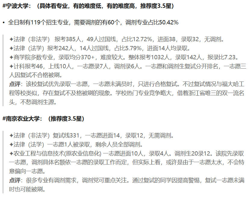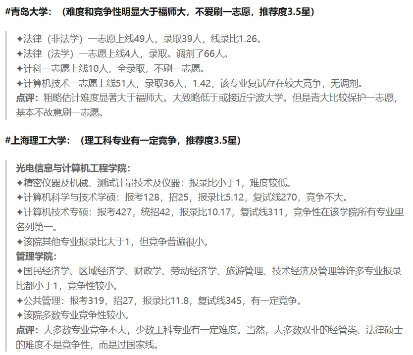 如果能直接獲取報(bào)錄比,則可初步量化難度,但要注意報(bào)錄比僅在同檔學(xué)校有效,如果套用在不同檔的學(xué)校,會(huì)死得很慘。對(duì)于考研萌新而言,咱門(mén)還需要進(jìn)一步分析難度。最好能發(fā)現(xiàn)那種復(fù)試線又低,專(zhuān)業(yè)課不壓分,又不刷一志愿的。好了,再來(lái)看,復(fù)試線+是否接受調(diào)劑/統(tǒng)招計(jì)劃+是否保護(hù)一志愿。什么意思呢?就是如果這個(gè)學(xué)校的這個(gè)專(zhuān)業(yè)劃線不高,說(shuō)明備考難度不大。如果接受調(diào)劑,說(shuō)明招不滿人。如果保護(hù)一志愿,說(shuō)明復(fù)試不會(huì)刻意刷人。