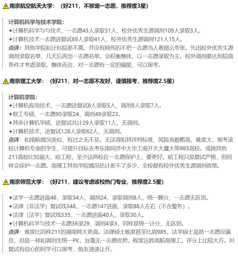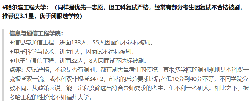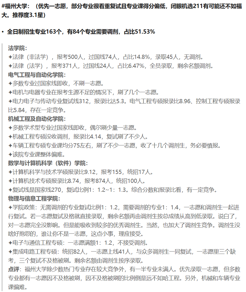 對(duì)于二三本乃至專(zhuān)科院校的同學(xué),千萬(wàn)別看某個(gè)普通大學(xué)的報(bào)錄比很低,就自信滿滿的報(bào)考了。你得了解該校該專(zhuān)業(yè)的歷史行為到底是傾向于寵一志愿,還是喜歡刷一志原然后收211的調(diào)劑生?以福大為例,不同專(zhuān)業(yè)做法截然不同,差距是天差地別。有的專(zhuān)業(yè)不管是否招滿人,都要嚴(yán)格提高復(fù)試要求,甚至在招不滿人的情況還要刷掉一半的人(因?yàn)橐恢驹咐锒鄶?shù)都是二三本的,你可以說(shuō)復(fù)試要求太嚴(yán)格沒(méi)通過(guò),也可以說(shuō)人家就不喜歡二三本的唄,怎么理解,你自己看)。還有的專(zhuān)業(yè),寵一志愿,一個(gè)都不能少。