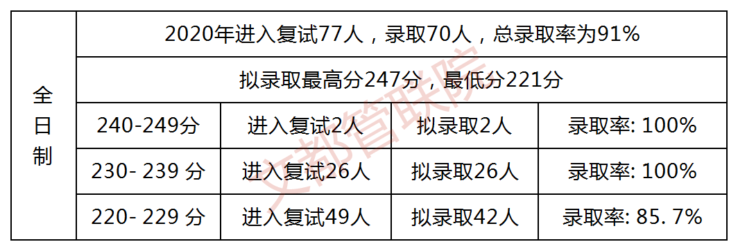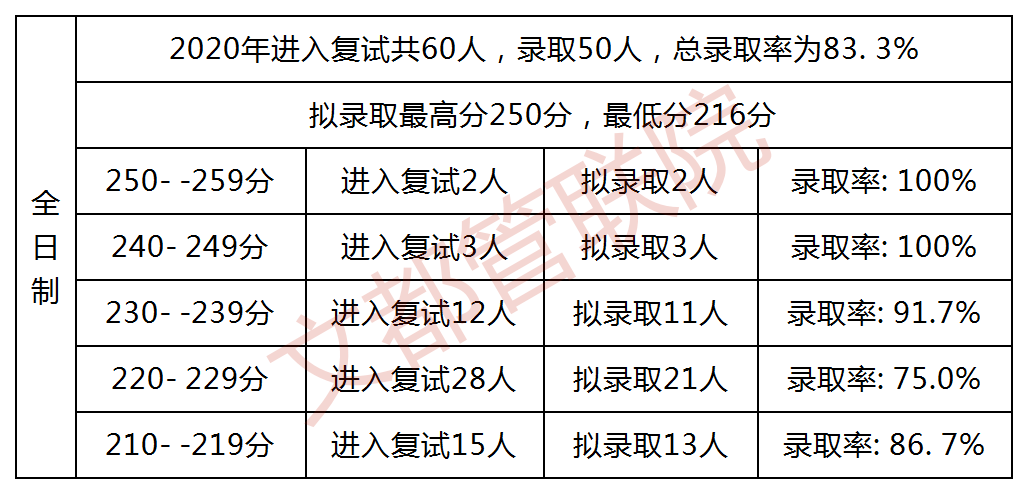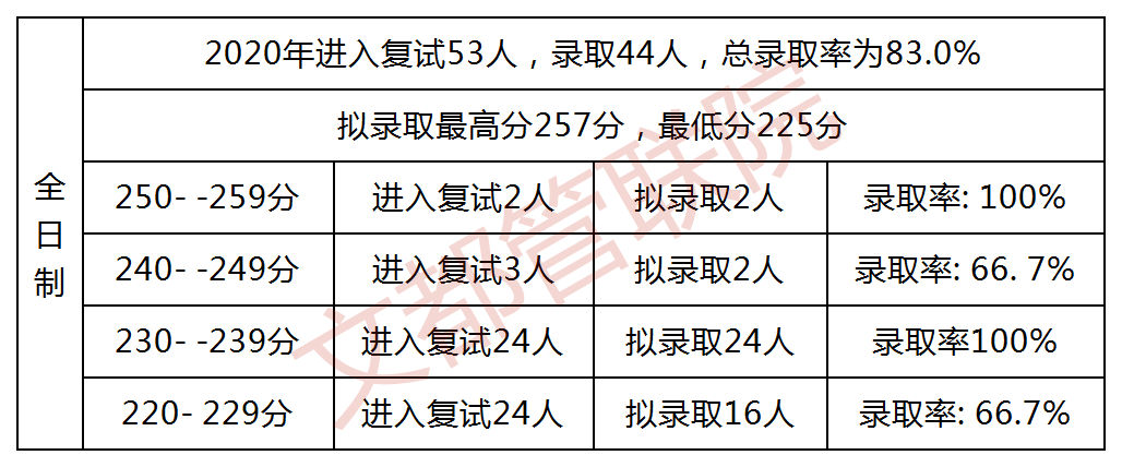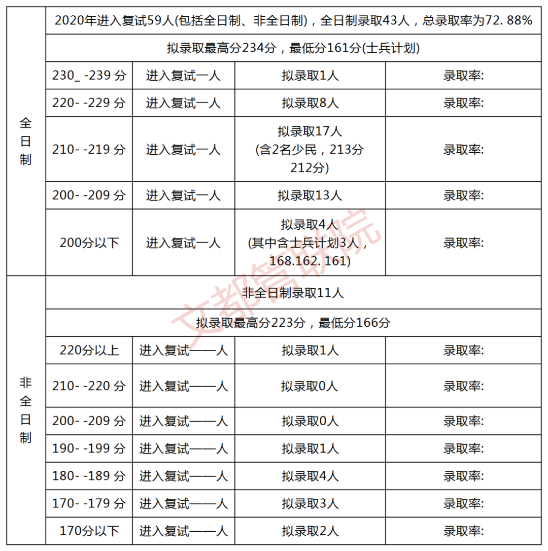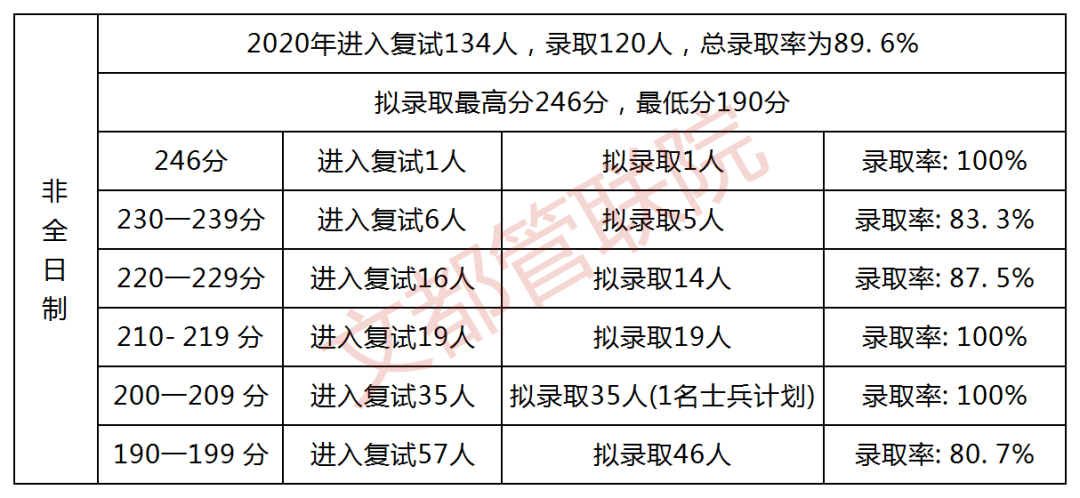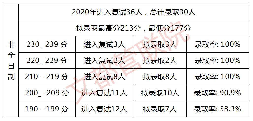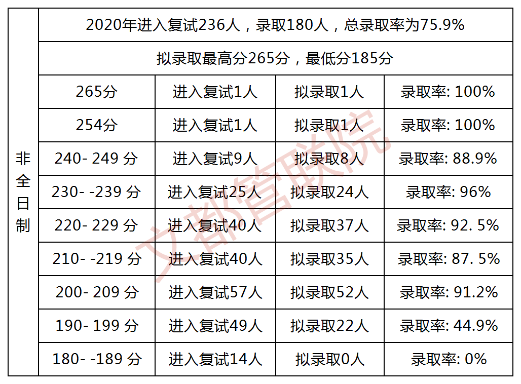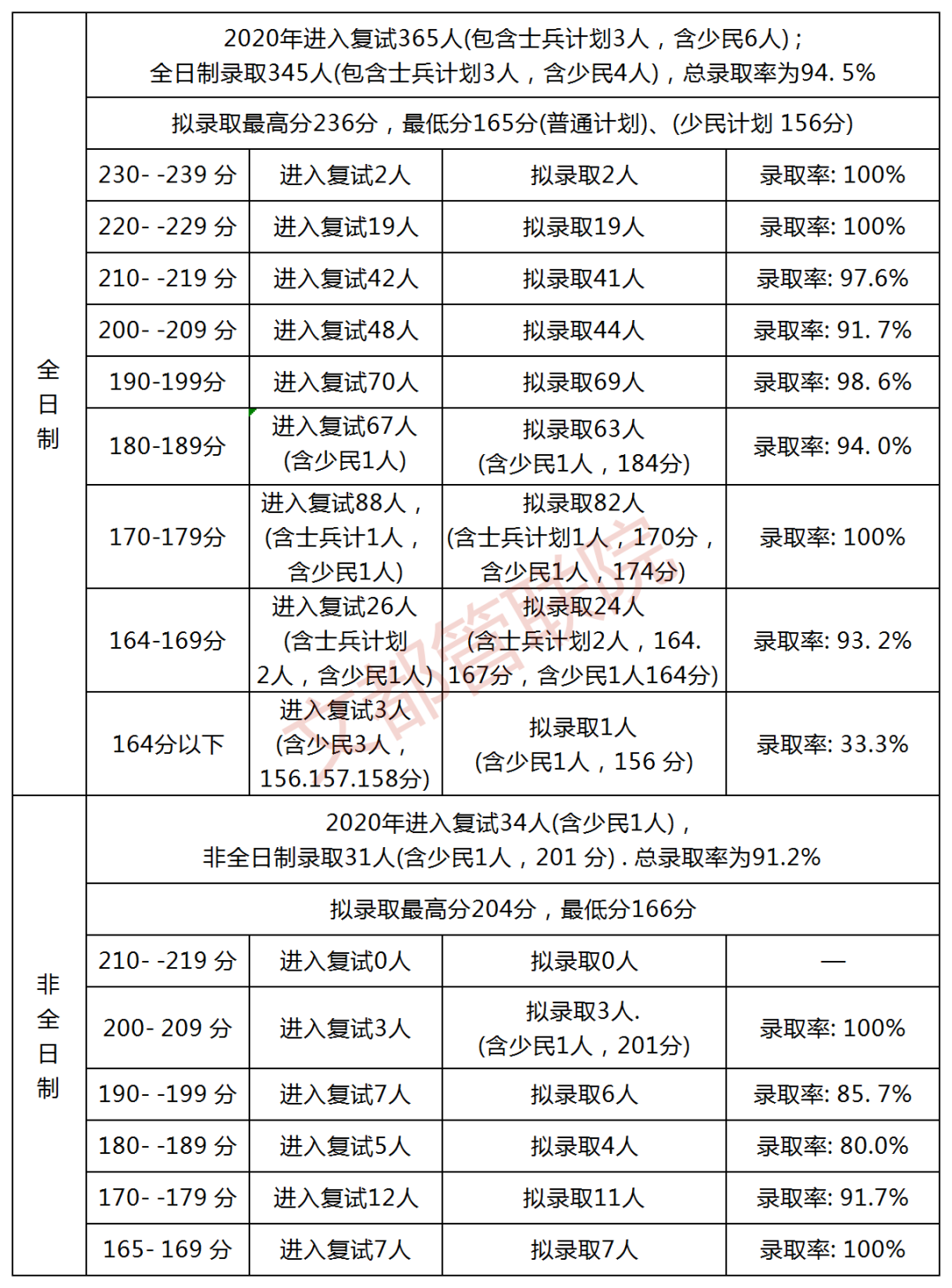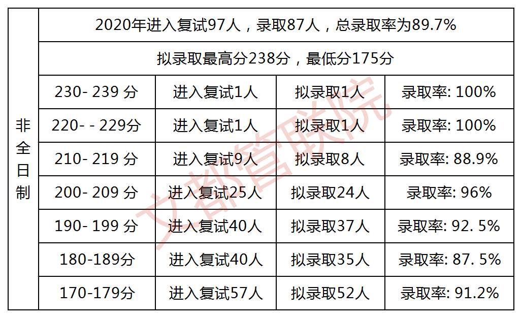 小編沒有找到具體的全日制、非全日制每個分數段進入復試的人數,只整理統計除了擬錄取人數,可以看到全日制總錄取率為72.88%,還是比較高的;而在非全日制中,進入復試的分數段也集中在200分以下。