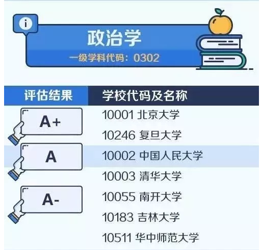 我們在考研擇校過程中,一般都會查一些專業院校排名,來幫助自己更好的選擇院校。在眾多排名之中,教育部第四輪高校學科評估,是迄今為止官方公布的唯一一份具有排名性質的學科榜單(不含港澳臺高校),具有比較權威的參考性。評估結果根據“學科整體水平得分”的位次百分位,將排位前70%的學科分為9檔公布:前2%(或前2名)為A+,2%~5%為A(不含2%,下同),5%~10%為A-,10%~20%為B+,20%~30%為B,30%~40%為B-,40%~50%為C+,50%~60%為C,60%~70%為C-。那么A檔學科,即最頂尖的學科(包括A+、A、A-三檔),都分布在哪些大學呢?今天我們一起了解下政治學排名A檔院校。