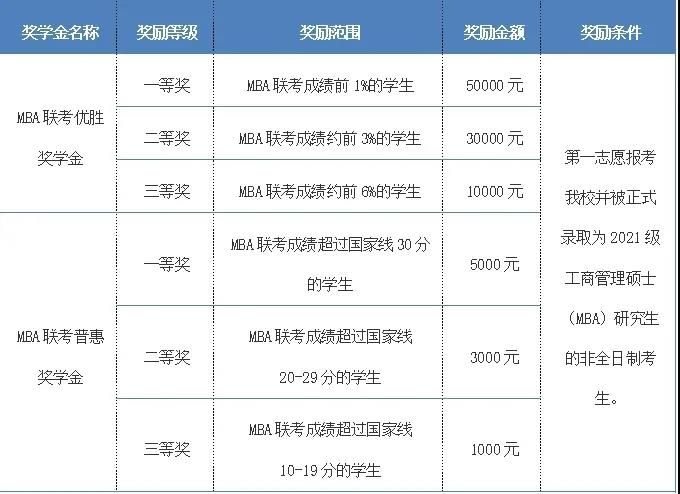 為了鼓勵(lì)優(yōu)秀人才攻讀非全日制工商管理碩士(MBA),培養(yǎng)更多品學(xué)兼優(yōu)的商界精英,北京交通大學(xué)MBA教育中心特設(shè)立MBA聯(lián)考優(yōu)勝獎(jiǎng)學(xué)金、MBA聯(lián)考普惠獎(jiǎng)學(xué)金。其獎(jiǎng)勵(lì)范圍、獎(jiǎng)金額度和獎(jiǎng)勵(lì)對象如表三所示。若有變動(dòng),均以具體通知為準(zhǔn)。