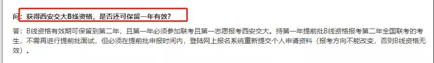 B線資格有效期可保留到第二年,且第一年必須參加聯考且第一志愿報考西安交大。持第一年提前批B線資格報考第二年全國聯考的考生,不需再進行提前批面試,但必須在提前批申報時間內,登陸網上報名系統重新提交個人申請資料(報考方向不能改變,否則B線資格無效)。