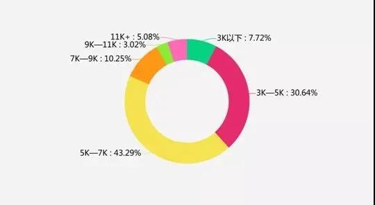 數據顯示:2019屆中國高校畢業生薪酬區間占比最大的是5K—7K,為43.29%;其次是3K-5K區間,占比為30.64%。