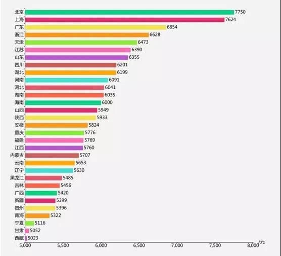 我國31個省市(不含港澳臺)中,北京市高校畢業生的崗位薪酬為7750元,領跑全國;上海則以7624元的平均崗位薪酬排名第二;廣東畢業生崗位薪酬為6854元,排名第三。