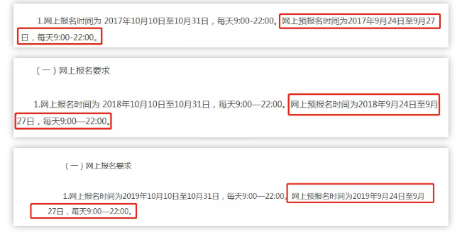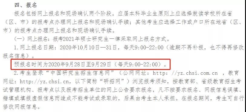 在此之前,2018-2020年的全國碩士研究生招生工作管理規(guī)定中提到的預(yù)報(bào)名時(shí)間均為考研當(dāng)年的9月24日-9月27日(每天9:00-22:00)。