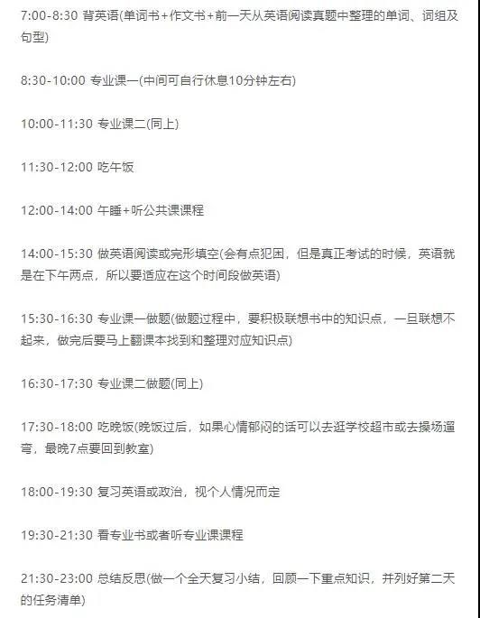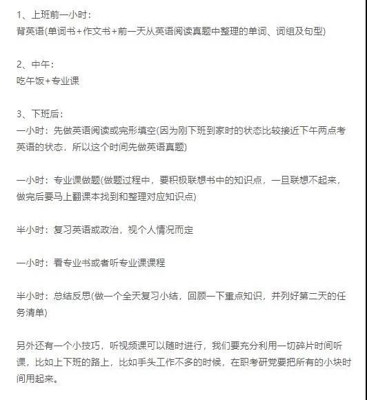 對于全職考研同學來說,整塊時間就是從早到晚,這個比較容易把握,只要想好一天、一周該做什么就行了,而對于在職考生來講就不一樣了。他們的整塊時間可能就是每天的晚上20:00——23:00,每周周一到周五3個小時,再加上周末的兩天。
