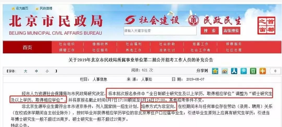 2019年8月7日,北京市民政局官網,發布了如下的一則補充公告,標志著事業單位首次將兩者放在同等地位。